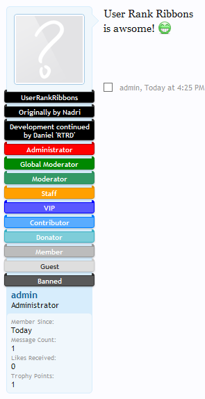 admin 发布了新资源: User Rank Ribbons 用户等级(版本 2.3)- 主题中帖子作者用户等级彩带效果 查看资源详情...