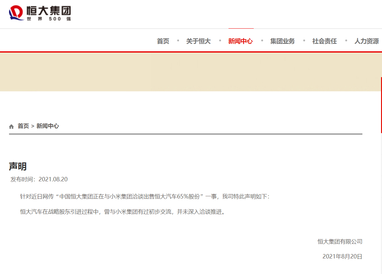 8月20日凌晨,据恒大集团官网,针对近日网传“中国恒大集团正在与小米集团洽谈出售恒大汽车65%股份”一事声明如下:恒大汽车在战略股东引进过程中,曾与小米集团有过初步交流,并未深入洽谈推进。 此外,恒大还公告称,2021年8月19日,恒大集团接受了人民银行、银保监会的约谈。恒大集团将全面落实约谈要求,坚定不移贯彻落实中央关于房地产市场平稳健康发展的战略部署,切实履行企业主体责任,全力以赴、想尽一切办法确保工程建设,保质保量完成楼盘交付;坚决依法依规做好重大事项信息披露,绝不传播并及时澄清不实信息;以最大决心、最大力度保持公司经营稳定,化解债务风险,维护房地产市场和金融稳定。