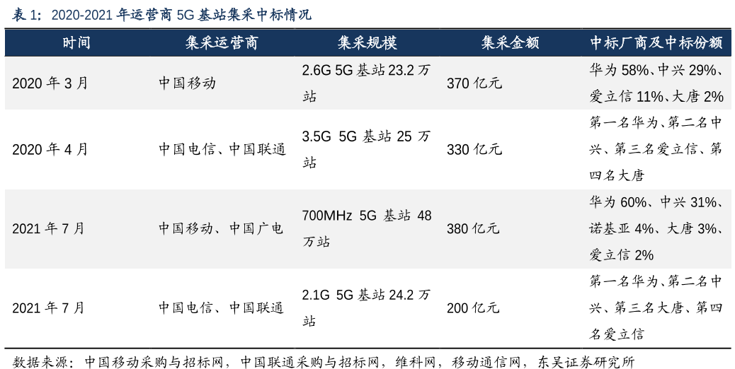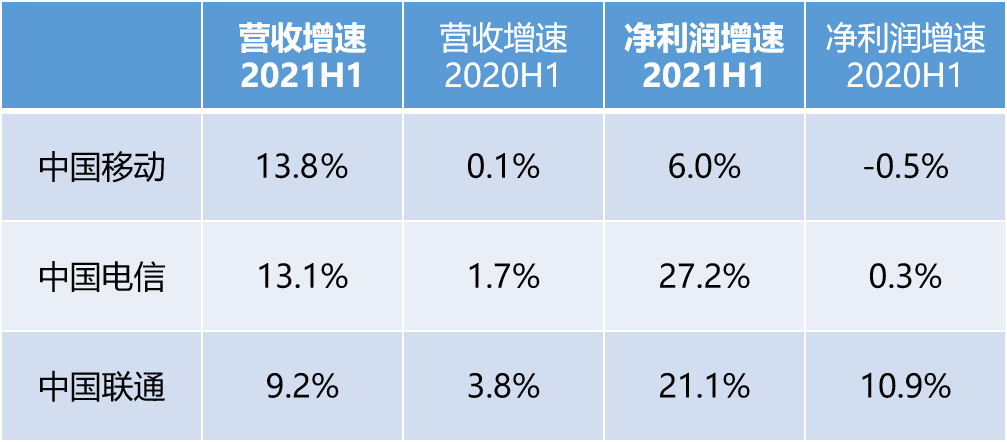 截至 8 月 19 日,中国移动、中国电信、中国联通三大运营商已陆续交出今年上半年的财报答卷。随着 5G 发展步入关键期,运营商们的业绩表现受到外界的极大关注。 总的来看,三大运营商上半年合计营收 8270.48 亿元,合计净利润为 860.28 亿元,相当于平均每天约赚 4.78 亿元,同比增长 11.4%。 5G 建设方面,上半年三大运营商新建 5G 基站数量比去年同期减少了约 9.7 万个。 另外,三大运营商在资本市场动作频频。今天,中国电信在上交所上市,开盘价 4.79 元涨超 5%, 盘中一度涨停 。8 月 19 日,中国联通发布公告称,考虑分拆所属子公司联通智网科技股份有限公司至 A 股上市 。8 月 18 日,中国移动也已经预先披露招股书,拟募资人民币 560 亿元。 营收、净利双增长 通过纵向对比,我们可以发现,三大运营商在今年上半年的营收、净利表现都不错,同比增速增长明显。要知道,去年上半年,中国移动的净利润曾一度出现负增长。 但需要注意的是,虽然中国联通上半年净利润 91.67 亿元,实现了同比增长 21.1%, 但经营利润出现了负增长,为 -0.3%。 横向对比来看,“大哥”中国移动的业绩处于领先位置,营收是中国联通的 2.7 倍,是中国电信的 2 倍;净利润是中国联通的 6.5 倍,是中国电信的 3.3 倍。 中国移动上半年营收 4436.37 亿元,同比增长 13.8%; 净利润 591.18 亿元,同比增长 6.0%。 其中,中国移动上半年个人市场收入占比 65.0%, 同比增速只有 0.7%, 而家庭、政企、新兴市场收入同比增速分别达到了 33.7%、32.4%、22.6%。 基于上半年的的业绩表现突出,中国移动首席执行官董昕在业绩电话会上表示,公司将全年通信服务收入、净利润目标由年初指引的“稳健增长”调整为“良好增长”。 上半年,中国联通营收 1641.74 亿元,同比增长 9.2% 。产业互联网收入增长迅猛,同比增长 23.6%, 达到人民币 280.3 亿元,占整体服务收入比例同比提升 2.5 个百分点至 18.9%。 移动服务收入同比提升 7.3%, 固网宽带接入收入同比增长 0.7%。 中国电信上半年营运收入 2192.37 亿元,同比增长 13.1%; 净利润 177.43 亿元,同比增长 27.2%。 中国电信在财报中指出,致力超额完成全年目标,上调相关指引:营收、净利实现双位数增长,产业数字化收入增长力争超过 20%。 上半年,中国电信移动通信服务收入达到 933 亿元,同比增长 6.9%, 移动用户达到 3.62 亿户,净增 1147 万户。固网及智慧家庭服务收入达到 574 亿元,同比增长 5.2%。 产业数字化收入达到人民币 501 亿元,同比增长 16.8%。 其中,天翼云收入达到了人民币 140 亿元,同比增 109.3%, 超过 2020 年全年总收入。 上半年 5G 建设进度放缓 自从 2019 年工信部向运营商发放 5G 牌照算起,我国 5G 商用已经走过两个年头。根据工信部数据,截至 6 月末,我国 5G 基站总数达到 96.1 万个,其中 1-6 月新建 19 万个 ,5G手机终端连接数达 3.65 亿户,比上年末净增 1.66 亿户。 另外,工信部等 10 部门近日联合发布 《5G 应用“扬帆”行动计划 (2021—2023 年)》,提出 5G 个人用户普及率超过 40%、 每个重点行业打造 100 个以上 5G 应用标杆等目标,推动 5G 的发展与应用。 从 5G 基站数量来看,今年上半年 5G 建设进度有所减缓。上半年三大运营商新建 5G 基站数量比去年同期减少了 9.7 万个,同比降低 33.7%。 (数据来源:运营商财报) 根据财报数据 ,2020 年中国移动累计开通 39 万个 5G 基站,今年上半年其累计开通 5G 基站 50.1 万个,两者相减可以得出,中国移动今年上半年新建 5G 基站约 11.1 万个。然而,去年上半年中国移动新建 13.8 万个 5G 基站 ,2021 全年目标新建 5G 基站 31 万个。 中国电信与中国联通今年上半年新建共建共享 5G 基站 8 万个。去年上半年为 15 万个 ,2021 全年目标是新增 32 万个。 光大证券指出 ,2021 年三大运营商资本开支计划增速较低,影响了行业景气度水平;同时上半年基站建设速度放缓,运营商集采招标延后,进一步压低市场预期 。6 ~ 7 月,运营商招标已陆续启动,行业面临边际改善。 随着 5G 三期招标落幕,下半年 5G 建设也将“回暖”。据了解,中国移动和中国广电联合集采了 48 万个 700MHz 5G 基站,集采总额约 380 亿元。中国电信和中国联通联合集采了 24.2 万个 2.1G 5G 基站,集采总额约 200 亿元。 从这次招标可以看出,运营商对网络覆盖诉求大于高速接入 。IDC 报告指出,移广 5G 基站采用 700M 频谱,而电联 5G 基站采用 2.1G 频谱,采用较低的频谱可以有效提升网络覆盖范围和深度,提升 5G 网络普遍服务能力,从而优化现有 5G 用户体验。此外,对于城市的热点区域依然采用 2.6G 和 3.5G 继续覆盖(不与低频重叠覆盖)。 在 5G 套餐用户方面,中国联通达到 1.13 亿户 ,5G 套餐用户渗透率达到 36.5%; 中国电信 1.31 亿户 ,5G 套餐用户渗透率达到 36.2%; 中国移动 2.51 亿户 ,5G 套餐用户渗透率达 36.18%。 在 5G 建设如火如荼展开的同时,三大运营商在资本市场也动作频频。今天,中国电信 A 股正式在上交所上市,开盘价 4.79 元涨 5.74%, 盘中中国电信 A 股一路拉升,股价涨超 16%, 临时停牌。 8 月 18 日,中国移动也已经预先披露招股书,拟募资人民币 560 亿元。中国联通董事长王晓初坦言,中国移动及中国电信回 A 股将令市场竞争加大,短期内对公司造成压力,但相信完成上市后市场将回归理性。