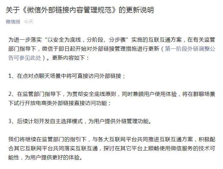 今年9月,在工信部等部门的推动之下,腾讯、阿里巴巴、字节跳动等巨头平台直接的封锁渐渐开始松动,但此前一直开放较为低级,而且有诸多限制,只有一对一私聊能用。据报道,腾讯今日发布关于《微信外部链接内容管理规范》的更新说明,其中显示微信已经进一步开放外链访问权限,在点对点聊天场景中将可直接访问外部链接。 此外,微信还将在群聊场景下试行开放电商类外部链接直接访问功能。 以下为说明全文: 为进一步落实“以安全为底线,分阶段、分步骤”实施的互联互通方案,在有关监管部门指导下,微信于即日起开始对外部链接管理措施进行更新(第一阶段外链调整公告可参见此处)。更新内容如下: 1、在点对点聊天场景中将可直接访问外部链接; 2、在监管部门指导下,为贯彻安全底线原则,同时兼顾用户使用体验,将在群聊场景下试行开放电商类外部链接直接访问功能; 3、后续计划开发自主选择模式,为用户提供外链管理功能。 我们将继续在监管部门的指引下,与各大互联网平台共同推进互联互通方案,积极配合其他互联网平台共同落实互联互通,探讨在其他平台上顺畅使用微信服务的技术可能性,为用户提供更好的体验。