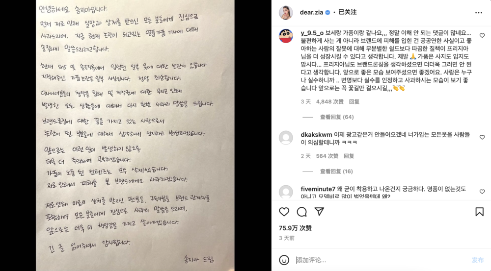 1月18日,她光速认错,在IG发布了道歉信,承认自己的部分衣物确实是假货。事已至此,她作为网红的职业生涯基本告一段落。可以遇见的是,未来不会有大品牌再和她合作。