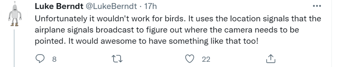 不过Luke表示,目前skybot还只能用于飞机的追踪,要在鸟类身上实现可能还得费一番功夫。
