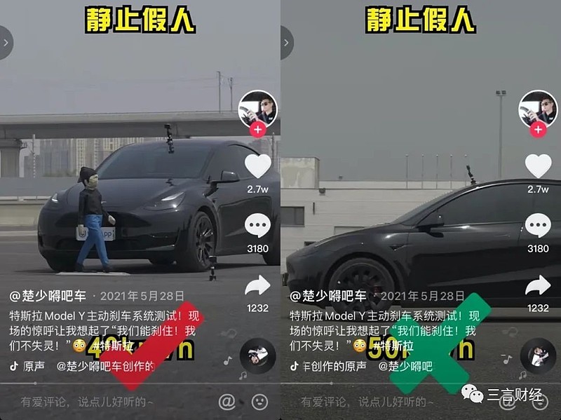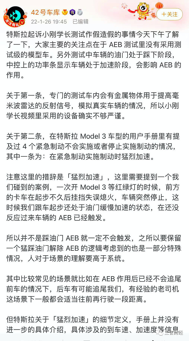 今日,有媒体报道称,特斯拉将于今日正式起诉某平台千万粉丝网红陈振罡(账号名称@小刚学长),据特斯拉透露起诉原因应为测试数据作假。特斯拉相关部门对此回应表示,确有此事,并且于今日正式向法院提交诉讼。 半年前的测试视频再惹争议 被质疑发生碰撞前踩电门 据悉,该事件起因源于2021年4月29日至30日,@小刚学长 先后在网络上发布了上下两部名为《拿两台爱车测试紧急制动》的视频。 据视频显示,测试内容为:@小刚学长 驾驶特斯拉Model 3和小鹏P7两款车型,在封闭道路内驶向提前已放置好的纸片假车和人型玩偶,在50km/h时松开加速踏板且随后不踩下制动踏板,仅凭借车辆的AEB(自动紧急制动系统)进行主动制动,未碰撞到障碍物即视为“测试”成功。 “测试”的结果显示,无论是纸片假车还是人型玩偶,小鹏P7均在发生碰撞前刹住了车。 而特斯拉Model 3两次均撞上了障碍物。其中,纸片假车测试没刹车,假人测试有刹车但没刹住。 视频中,@小刚学长 还接到了小鹏某服务中心打来的电话,称其收到了总部发过来的一个碰撞预警信息,打电话跟进一下,问一下情况。 @小刚学长 在视频中强调自己没有踩谁或者捧谁,两台都是他自己的爱车,他只是做了个简单的测试,并且记录下来。但有不少网友对此调侃称,@小刚学长 收了小鹏的广告费。 当时,此事就曾在网络上引发热议。时隔半年多,此事再度登上热搜。 值得一提的是,从今年1月19日起,另一博主 @小李飞车 陆续发布多条视频锤@ 小刚学长。 @小李飞车 在视频中表示,@ 小刚学长《拿两台爱车测试紧急制动(上)》视频中,特斯拉Model 3在撞向纸片假车前踩了电门。 事实上,在当时就有网友指出,@小刚学长 在Model 3碰撞前踩了电门。 有网友在视频中发现,在本该由车辆滑行并等待AEB介入的“测试”阶段,特斯拉Model 3的中控屏上方仍有“能量条”显示,而在即将碰撞到障碍物之前也能够看到较淡的“能量条”,“能量条”即代表着汽车有动力进行输出,进而推测@小刚学长 在这一过程中曾踩过加速踏板。 到底踩电门没有?什么时候踩的? 能量条是怎么原理?比如特斯拉Model 3新系统,打开动能回收情况下,踩电门“能量条”会往右涨,颜色为灰色;松电门“能量条”会往左涨,颜色为绿色。而小刚的测试车辆或为旧系统。 两个视频中,均有“能量条”的画面。《拿两台爱车测试紧急制动(下)》视频中,出现“能量条”是在车辆起步的时候,这没什么争议。 而在《拿两台爱车测试紧急制动(上)》视频中,车辆里驾车已经距离很近的时候,“能量条”出现了,这是引起争议的关键。 不过,@小刚学长 在2021年4月30日曾发布视频《特斯拉测试无剪辑实录》来回应质疑。视频显示,在碰撞之前,特斯拉识别到了假车,而且这一次没有踩油门,但还是撞到了假车。 @小刚学长 表示,因为第一次测试有人说他踩油门了,才给特斯拉多一次机会,又测试了一次,并且没踩油门,结果还是没刹住。 踩电门是否代表测试作弊? 这个事件的关键点是,就算踩了电门,就等于测试作弊吗?他没有踩电门的测试,算不算准确的测试结果? 1月22日,@小刚学长 在小号@小刚的日常 中发布了一则视频,再次回应质疑。 @小刚学长 表示,特斯拉车主手册上面写了四个不会紧急制动的条件,其中有一项是,“在紧急制动实施制动时猛烈加速”,而他踩的那一脚算不上猛烈加速。 @小刚学长 在视频中称,轻点油门并不会影响紧急制动介入,自己点一下油门的原因是为了满足当时50公里时速的测试标准。之前收油太早,动能回收把速度降下来了。 @小刚学长 表示,在第一次测试后,自己感觉操作上是有一些失误的,所以进行了第二次测试,在没有点油门的情况下,Model 3依旧没有刹住车。 @小刚学长 的测试视频之所以会引发争议,是因为测试中车辆的油门处于踩下阶段,“能量条”显示车辆处于加速阶段,会影响紧急制动的作用。 汽车达人42号车库认为:专门的测试车内会有金属物体用于提高毫米波雷达的反射信号,模拟真实车辆的情况,所以小刚学长视频里采用的设备确实不够严谨。 在特斯拉 Model 3 车型的用户手册里有提及过 4 个紧急制动不会实施或者停止实施制动的情况,其中一条为:在紧急制动实施制动时猛烈加速。 但特斯拉关于“猛烈加速”的细节定义,手册上并没有进一步的具体介绍。 “一个我们碰到的案例,一次开 Model 3 等红绿灯的时候,前方的卡车在起步不久后挂挡失误熄火,车辆突然停止,这时候我们跟车起步还处于油门缓慢加速的状态,在还没反应过来车辆的 AEB 已经触发。 所以并不是踩油门 AEB 就一定不会触发,之所以要保留一个猛踩油门解除 AEB 的逻辑考虑到的也是一部分特殊情况,人对于场景的理解要高于系统。” 除了@小刚学长 还有谁进行过小鹏和特斯拉的紧急制动呢? 其他博主的评测结果 懂车帝:特斯拉表现最佳 易车App主持人楚少:Model Y时速70公里完成自动刹车 2021年2月,懂车帝曾发布对特斯拉Model Y、蔚来EC6、奥迪Q5L三款车型紧急制动功能的测试视频,懂车帝称“特斯拉在三款车中表现最佳”。 2021年5月2日,账号@懂车大侦探 又发布小鹏P7 AEB主动刹车测试的视频。 视频中,小鹏P7在时速30公里的情况下,撞上静态横放的假车。经多次测试,小鹏P7才完成在时速30、40、50公里的情况下,静态假车的测试。 2021年5月28日,易车App主持人@楚少嘚吧车 也曾发布特斯拉Model Y主动