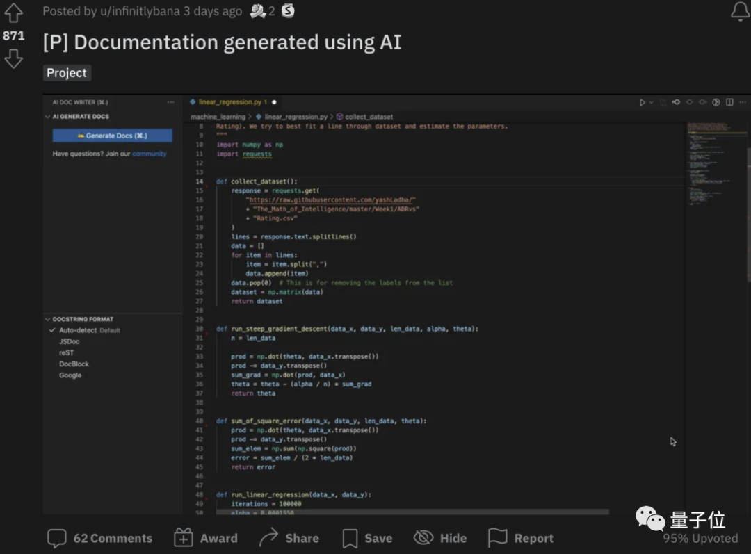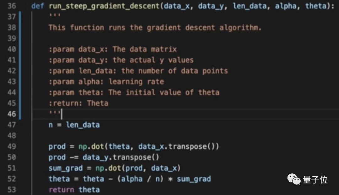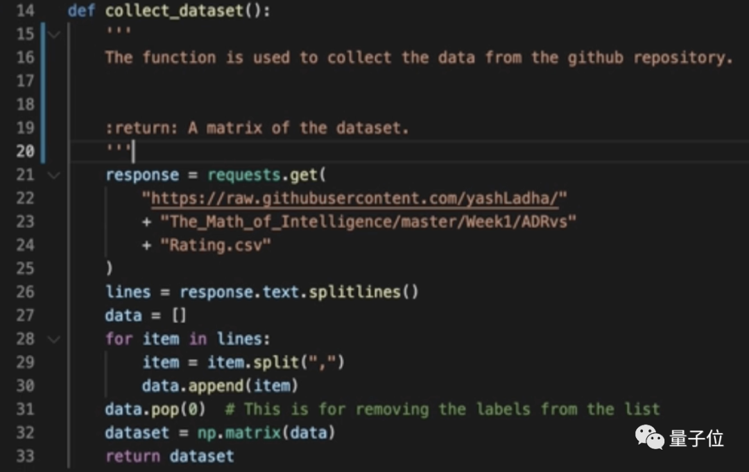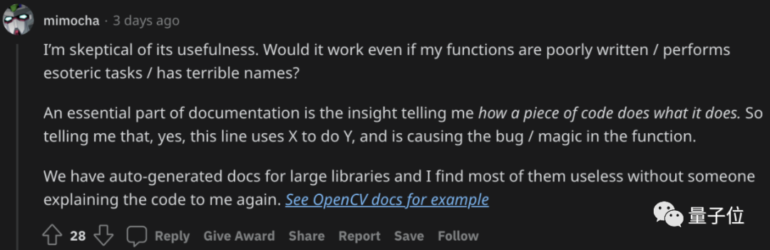 GitHub Copilot最近又出了个新功能。这一次,它不再是帮你写代码了,而是充当一个“翻译官”:用“人话”告诉你,这段代码到底写了啥。瞧,只需要选中一段代码,然后点一下旁边的“Ask Copilot”,就会快速得到代码的“人话版”解释: 示例中的代码片段是这样的: if len(l)=0: return Nonelse: max_int=l[0] for i in l if i>max_int max_int=i return max_int Copilot 对此进行“翻译”后,输出的内容是: 定义一个函数 max_int (),它将一个列表作为输入。 设置一个变量 max_int=l [0],它包含列表中的第一个元素。 设置一个 for 循环,迭代列表中的每个元素。 如果元素大于 max_int,便让 max_int 等于 I。 返回 max_int。 这便是 GitHub Copilot 的最新功能 ——Explain Code。之前 Copilot 是基于人类的注释生成代码,现在好了,它也学会了反向输出。 网友们的反应也是可想而知了: 但在“新奇”之后,这件事也引发了不小的讨论。 AI 给代码做注释,有必要吗? 不仅是 Copilot,“AI 给代码做注释”这事最近在 Reddit 也比较火。 有位贴主上传了他用 AI 技术,给代码做注释的 demo。不同于 Copilot 的 Explain Code,这个 AI 不会非常详尽地去描述每行代码运行的过程。而是概括性地去讲“这段代码是干嘛的”。 以下面这个代码片段为例: 在 AI“解读”过后,它就会告诉你: 这段代码是用来从 GitHub 的 Repo 中收集数据。会返回一个数据的矩阵。 再如下面这个代码片段: AI 给出的注释是: 函数运行的是梯度下降算法。 而后它还会对函数中的变量依次做解释。看似不错的效果,但依旧还是引来了网友们激烈的讨论。 “乐观派”网友认为: 辅助写注释和写测试比写代码的帮助大更多,而犯错可能更少。 但有人质疑这种 AI 的能力: 如果我函数写的特别乱、变量这名字乱糟糟的,它还能好使吗? 也有人认为,诸如此类的 AI“没有什么用处”: 更形象一点的比喻,这种 AI 起到的作用,可能就是“复读机”…… 那么对于“AI 给打码写注释”这件事,你觉得是否有用呢?