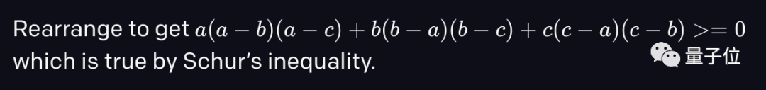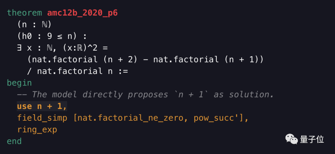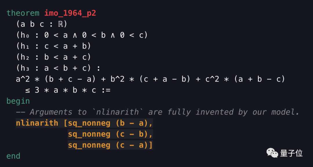 AI 在最不擅长的数学方面,这次大幅刷新了最好成绩。其中关键角色是 OpenAI 给 Lean 做的一个定理证明器。听起来有点耳熟?没错,就是去年参加国际数学奥林匹克竞赛(IMO)的“非人”选手 Lean~ 自从 2013 年微软研究院推出 Lean 以来,就一直尝试让 AI 在数学命题证明这方面取得进展。 而这次也确实得到了回报,OpenAI 新做的这个定理证明器让它学会了解决一部分有难度的高中奥数题,包括美国的数学竞赛 AMC12、AIME 甚至是国际奥数竞赛中的题。 它首先会用语言模型将数学问题转化为另一种形式,列出隐藏的条件和已知信息,然后来推理求证。 虽然在刚开始效果并不明显,只能证明几个命题。但是在不断地搜索新的证明,经过八次迭代之后,在 miniF2F 测试中,成功地把分数从 29.3% 刷到了 41.2%。 我们来看看这 AI 是怎么在奥数题上施展拳脚的。 AI 如何做奥数题 先来看一个简单的问题热热身: 对于所有大于等于 9 的整数 n,证明下图中的式子是一个完全平方数。 按照普通人的思考方式,可以先把式中分子提出一个 n 的阶乘,与分母约去。 然后分子化简为(n+1)2。这在形式上就是一个完全平方数,问题得证。 那 AI 是怎么做的呢? 它首先从文本中提取了条件和已知信息,例如 n 是整数、n 大于等于 9。 接下来,它把需要证明的问题换了一种说法,改为: 存在一个整数 x,使 x2和原式相等。 然后在解题的过程中,完全由模型直接生成了一个数学项“n+1”作为一个解:use n+1。接下来再去验证这个解是否成立。 如果没有语言模型,这是不可能做到的。 这么看来这模型能耐了,还有了一些数学想法,再拿一道国际奥赛的改编题来考考它: 设 a、b、c 是一个三角形的三条边,证明 a2(b+c-a)+b2(c+a-b)+c2(a+b-c)≤3abc。 同样地,AI 还是先把条件都列出来。不过这次还列出了与三角形有关的隐藏条件: a、b、c 都是大于 0 的实数,并且有任意两边之和大于第三边。 然后模型还自创了一个方法,列出了(b-a)、(c-b)、(c-a),看起来好像不明所以。 但是如果把目标式子展开,你就会发现这三项正是舒尔不等式的几个对称项: 根据舒尔不等式,对所有非负实数 x、y、z 和正数 t,都有: 当 t=1 时,这和奥数题中的形式完全一样,命题得证。 这么看来,AI 这水平着实不简单啊,要构造出这种效果可绝非易事。 对奥数下手的难点 让 AI 来做奥数,确实比学生自己磕高数题难多了。 这第一个难点就是,模型不是从有限的选项中做选择。要是像下围棋那样,格点就那么多,选择空间有限,还好说一点。 但是做奥数,模型要从一组复杂的无限策略中做选择,期间还要生成一些数学中的术语,例如“存在”、“任意”等。 针对这个难点,OpenAI 通过在搜索证明方法时从语言模型中采样来解决。 而第二点就是模型缺乏自我对抗和博弈。做奥数题和双人游戏不同,它不是和另一个玩家比赛,而是要证明一个数学命题。 这样一来在双人游戏上成功的算法就不能迁移过来。 为了解决这个问题,研究人员提供了一套不同难度“教辅资料”,用来辅助描述问题而不需要证明。 当这些辅助的描述难度越来越大时,模型就能解决越来越难的问题。 不过这两个难点,反倒可以成为它的优势。 一方面,因为这类数学命题的证明就是需要推理,需要无限的创造力和洞察力。 另一方面,这种辅助描述式的方法也有助于 AI 自动推理的发展。 说不好,将来深度学习模型还能征服奥数这座高山。 参考链接: https://openai.com/blog/formal-math/