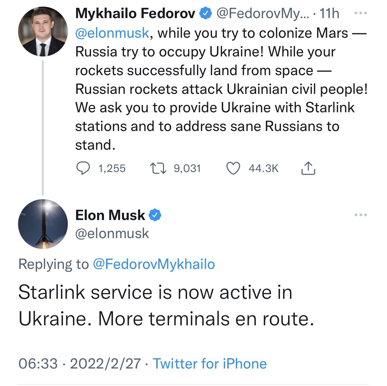 乌克兰民众仍然处于俄罗斯的入侵之下,基辅等城市的互联网基础设施可能随时遭到破坏而无法使用,但民众将迎来一个新的盟友:SpaceX的Starlink互联网。乌克兰副总理兼乌克兰数字转型部长Mykhailo Fedorov在十几个小时前向SpaceX首席执行官Elon Musk提出了供应Starlink互联网的要求。当地时间就在本周六下午,马斯克回复说:"Starlink服务现已在乌克兰启动。更多的终端正在路上"。 费多罗夫回应马斯克说,"谢谢你@elonmusk,谢谢大家,支持乌克兰!"。 Starlink是一个位于低地球轨道的人造卫星星座,允许互联网覆盖地球上的任何地方。地面上的用户需要卫星天线连接到Starlink卫星和地面站,以获得相比以往卫星通信技术更高速和低延迟的互联网连接。 在乌克兰部署Starlink的最新情况意味着,如果俄罗斯军队破坏了互联网通信,当地政府官员将能够保持在线并持续实现对外联络。 SpaceX最近还帮助汤加接通了Starlink互联网,此前一座火山切断了该岛国的光纤电缆,导致全国通信中断。 当然Starlink服务也从未忘记它的设计初衷,为运营商难以企及的全球农村地区提供高速互联网。
