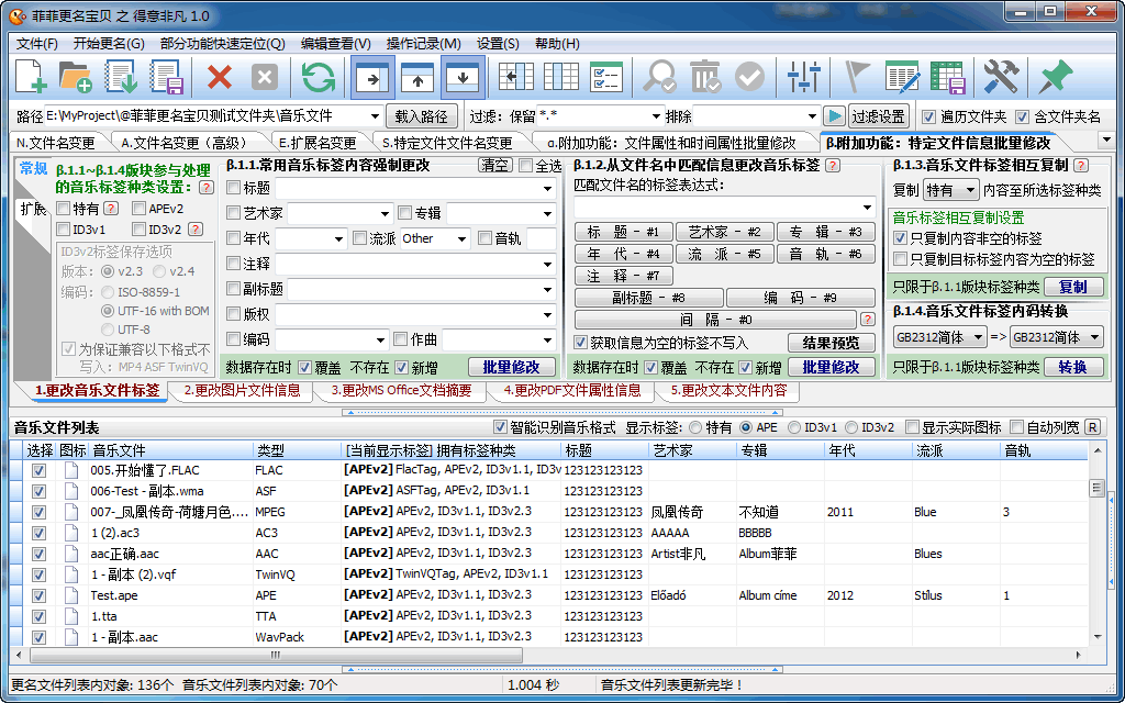 ■ 支持提取标签更名和批量修改标签的音乐文件标签种类:各音乐格式自有标签和APE、ID3v1和ID3v2标签;支持音乐格式包括:MP3、APE、FLAC、ASF、AAC、OGG、MPC、MP4、TTA、AC3、WavPack、OptimFrog、TwinVQ